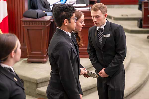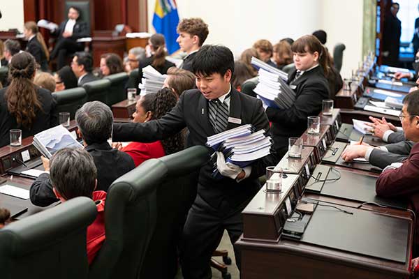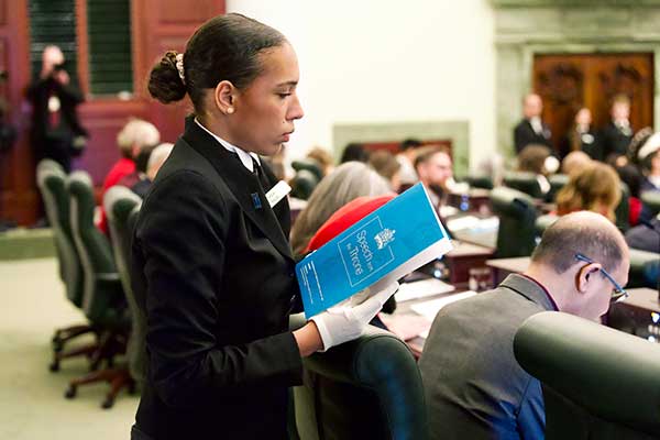 Pages work as part of a team with the Ceremonial and Security Services branch, led by the Sergeant-at-Arms. A Page’s primary job is to distribute messages and documents within the Chamber and to offices within the Legislature Building for Members, officers and staff of the Legislative Assembly.